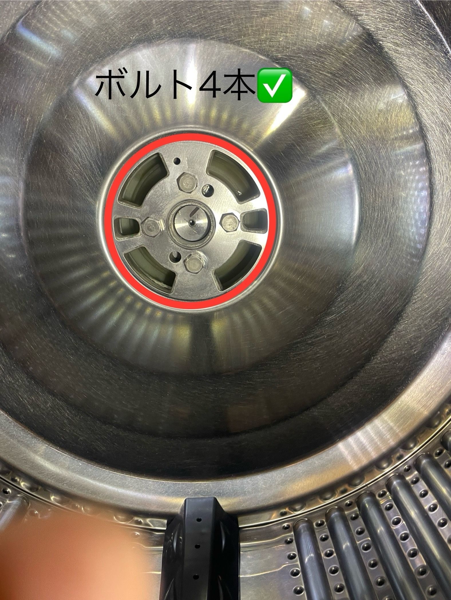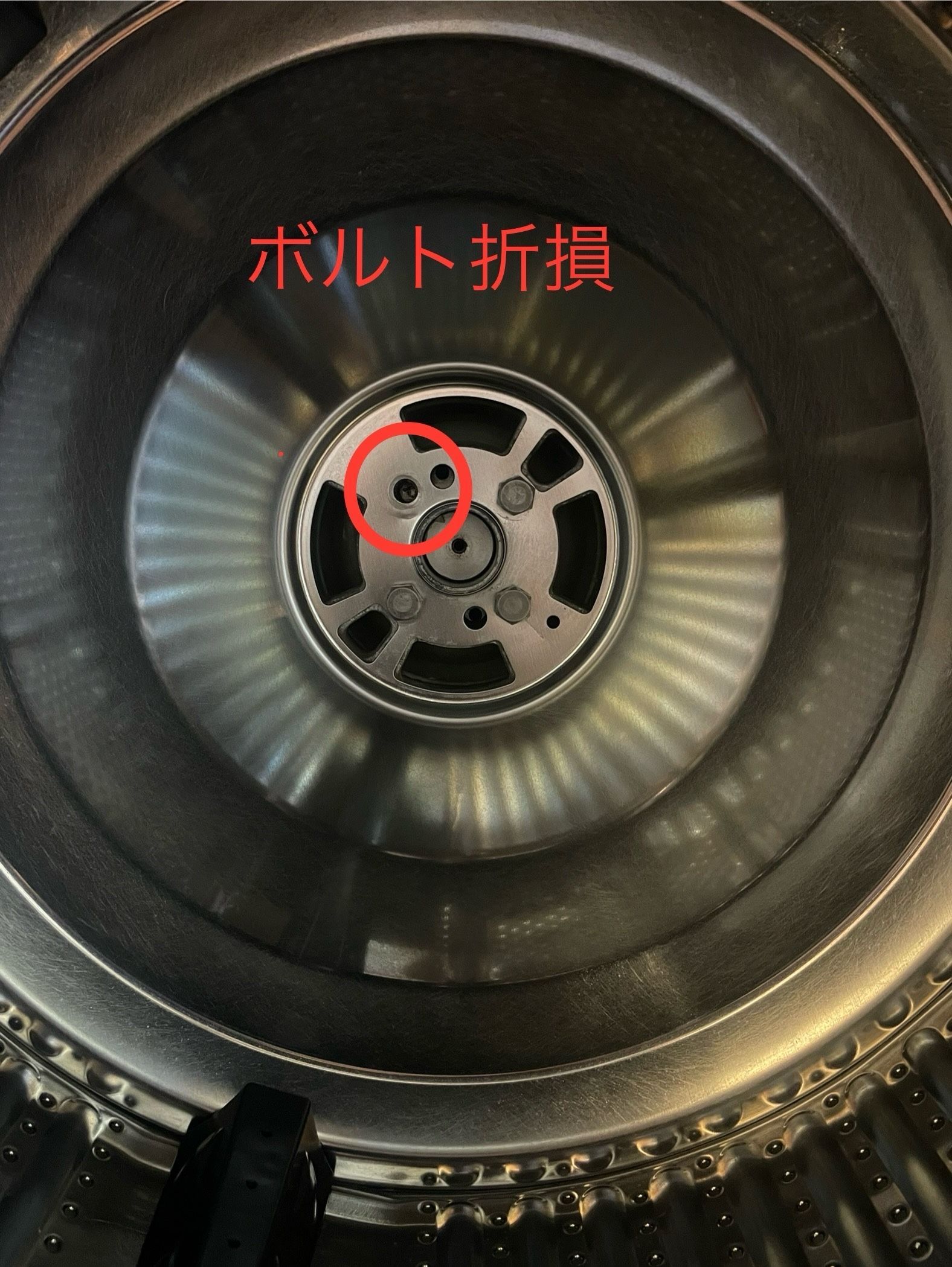 ドラム槽を固定しているボルトのうち、1本が完全に回らない状態。