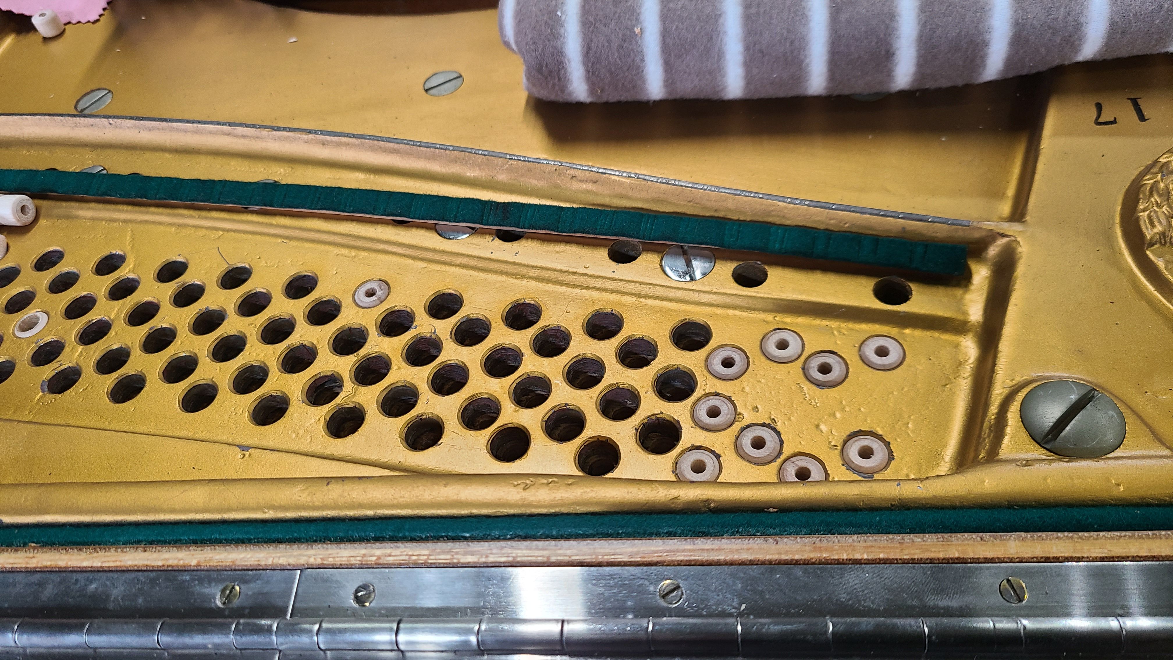 弦も外し終えたのでピンブッシュを入れて行きます。フレームのホールは深さが全て一定では無いので計りながら
