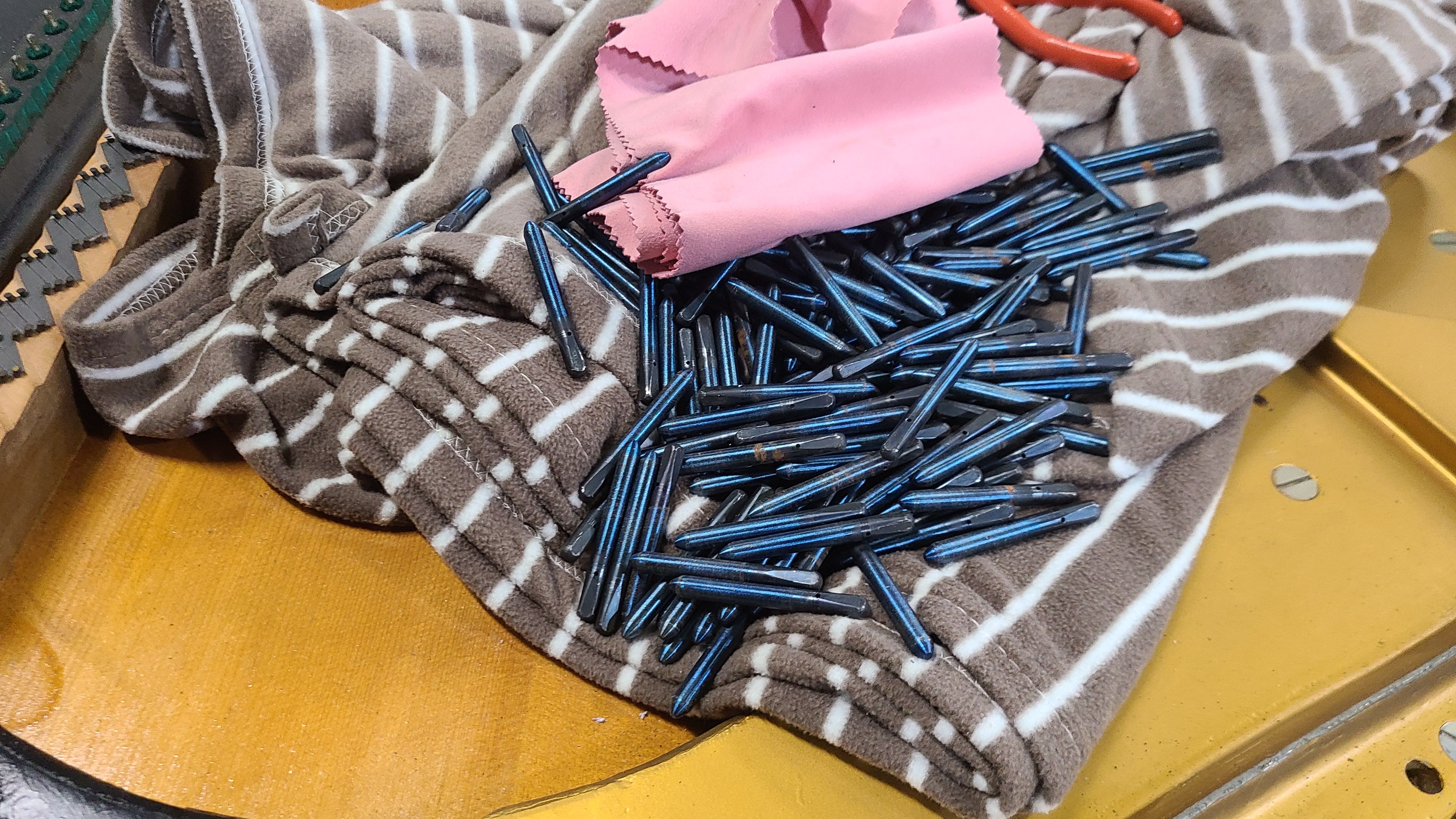 抜いたチュウニングピン(弦を張るためのピン)の一部です。始まったばかりですが既に腕が痛いです。まだまだ増えます。