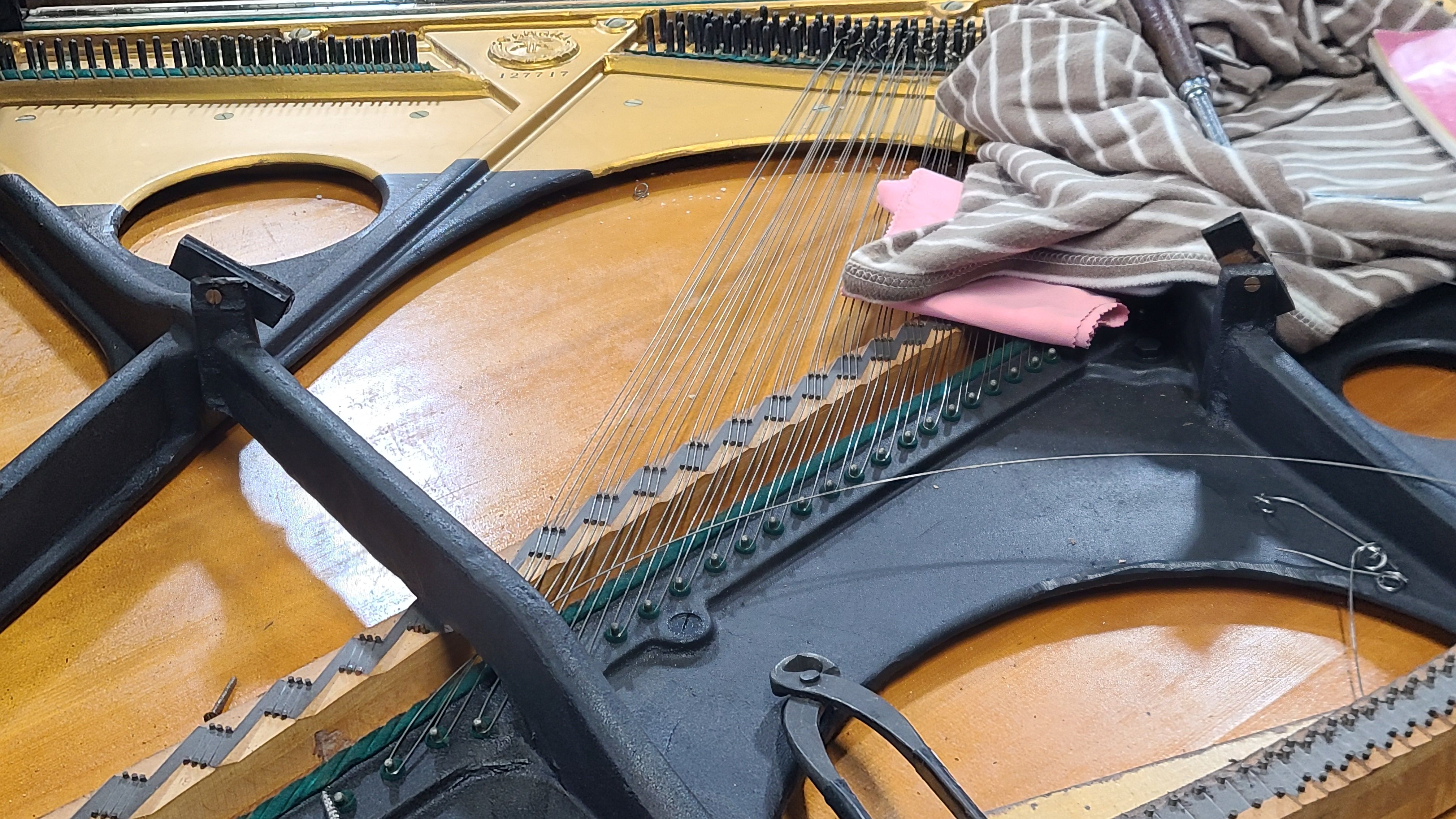 さっ!弦をドンドン外していきます。だいぶ古いピアノですが、しっかりしていますね。