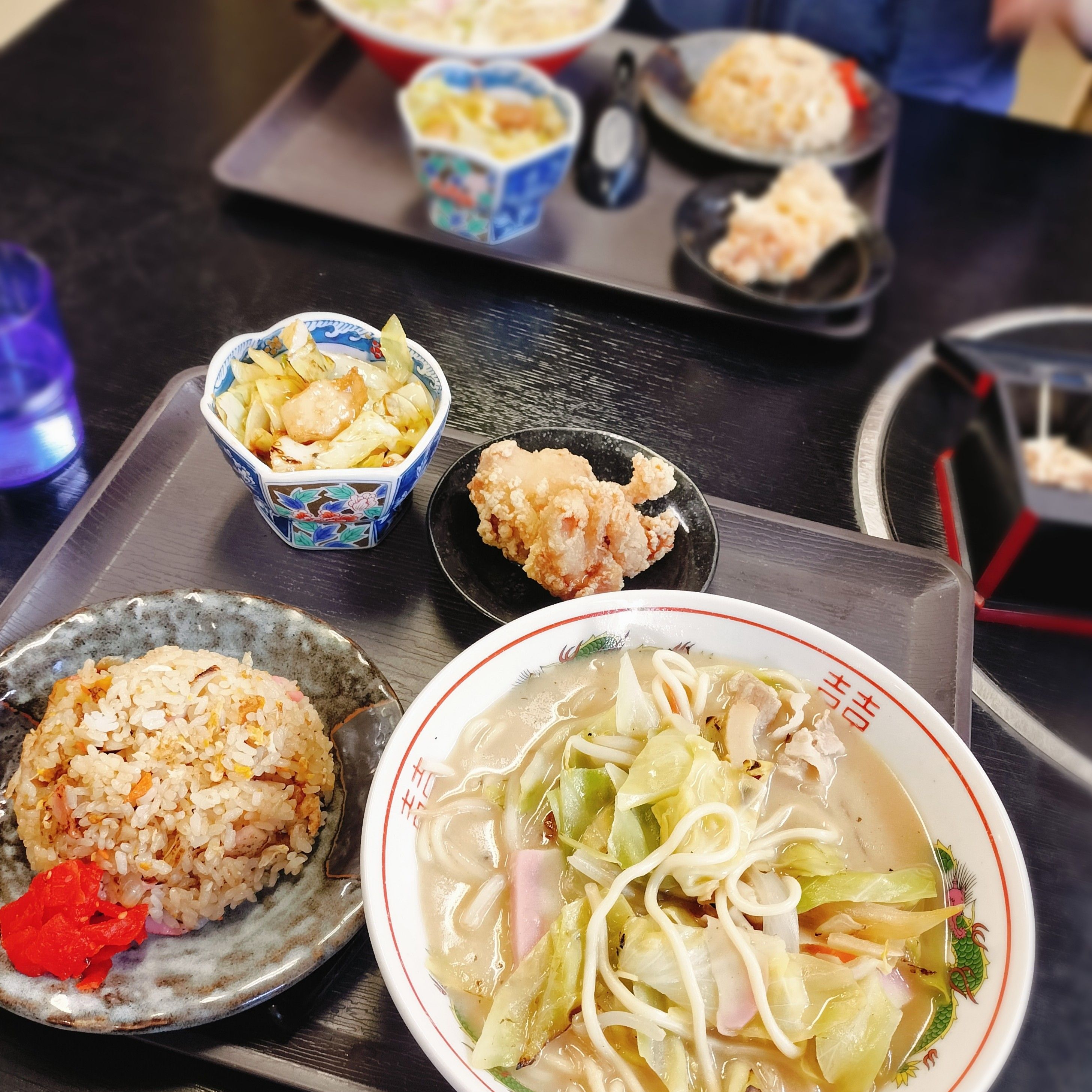 ちゃんぽん+チャーハン+唐揚げ+モツ炒めのがっつり定食。