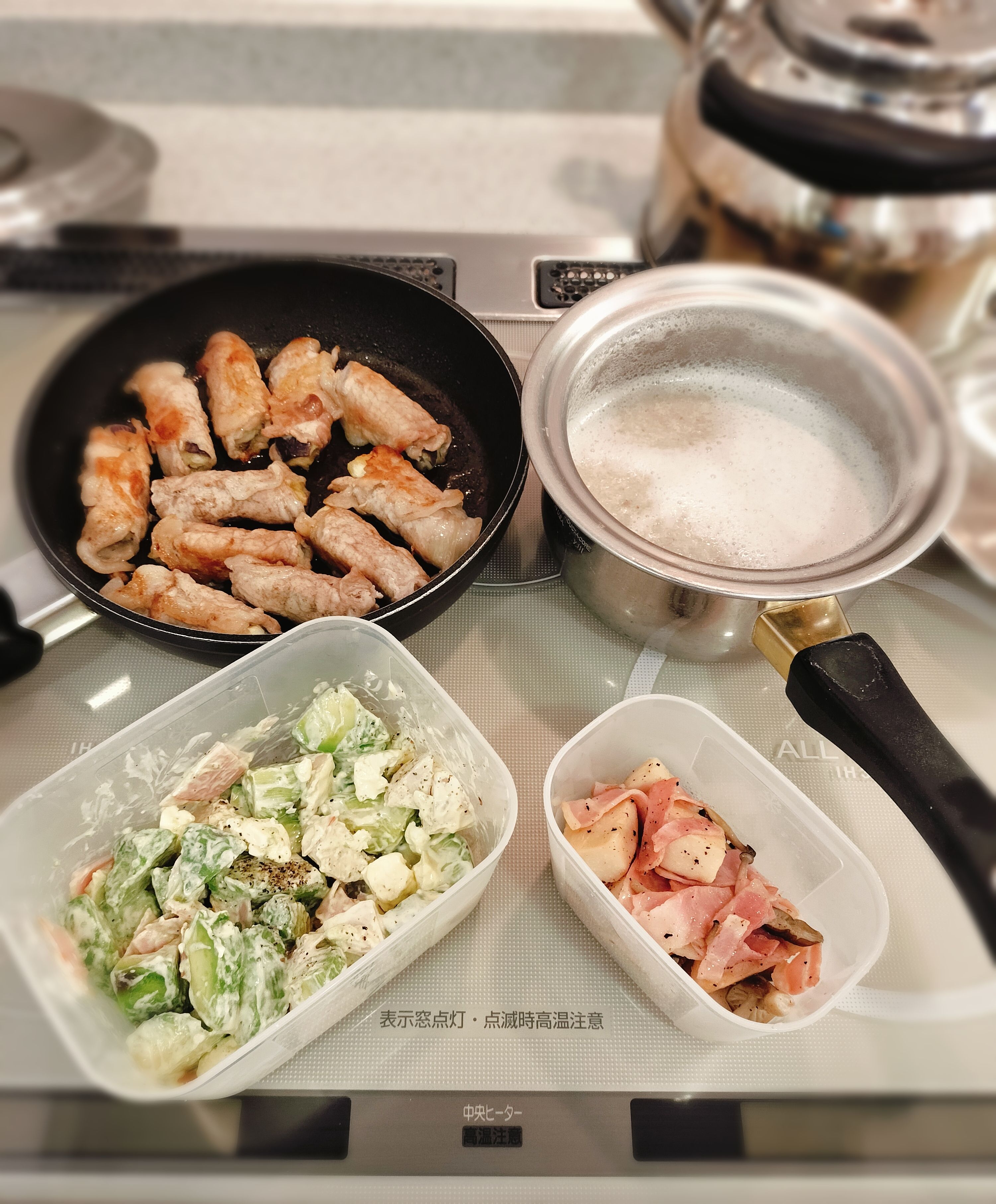 メインはナスの豚肉巻き。焼ける香ばしい匂いがキッチンいっぱいに広がりました。