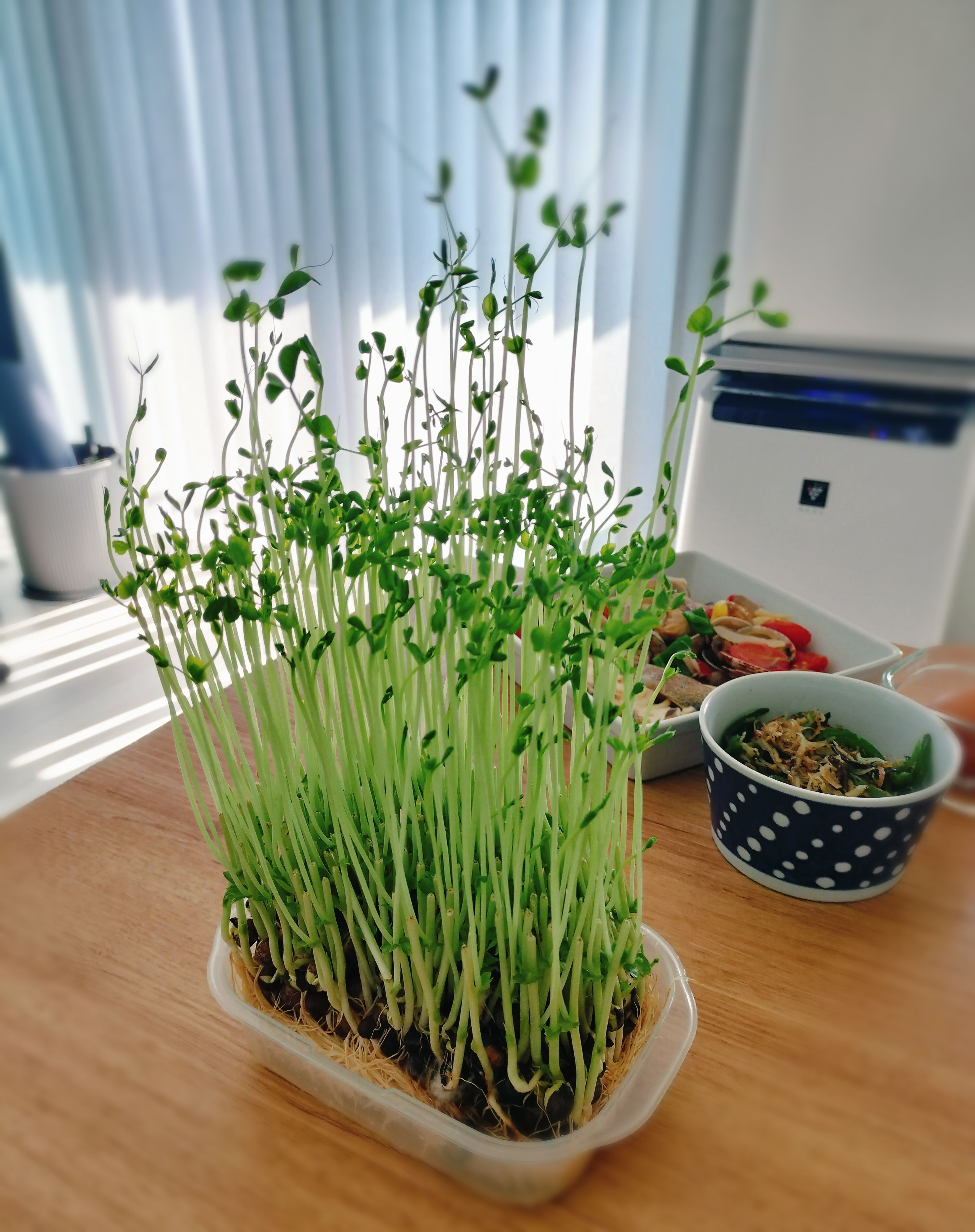 そしてキッチンの片隅には、前回使った豆苗が🌱