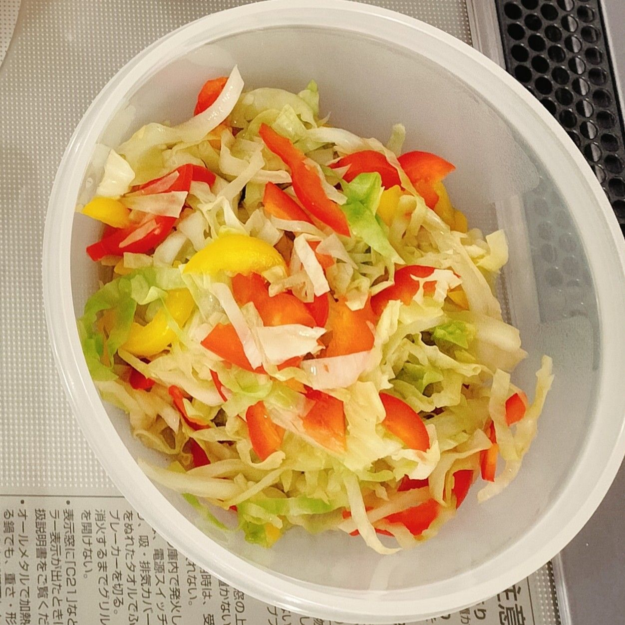 キャベツ(今回はパプリカ入り)を2〜3ミリ幅に千切りし、塩を入れた沸騰湯にサッとくぐらせて、すぐザルへ。
