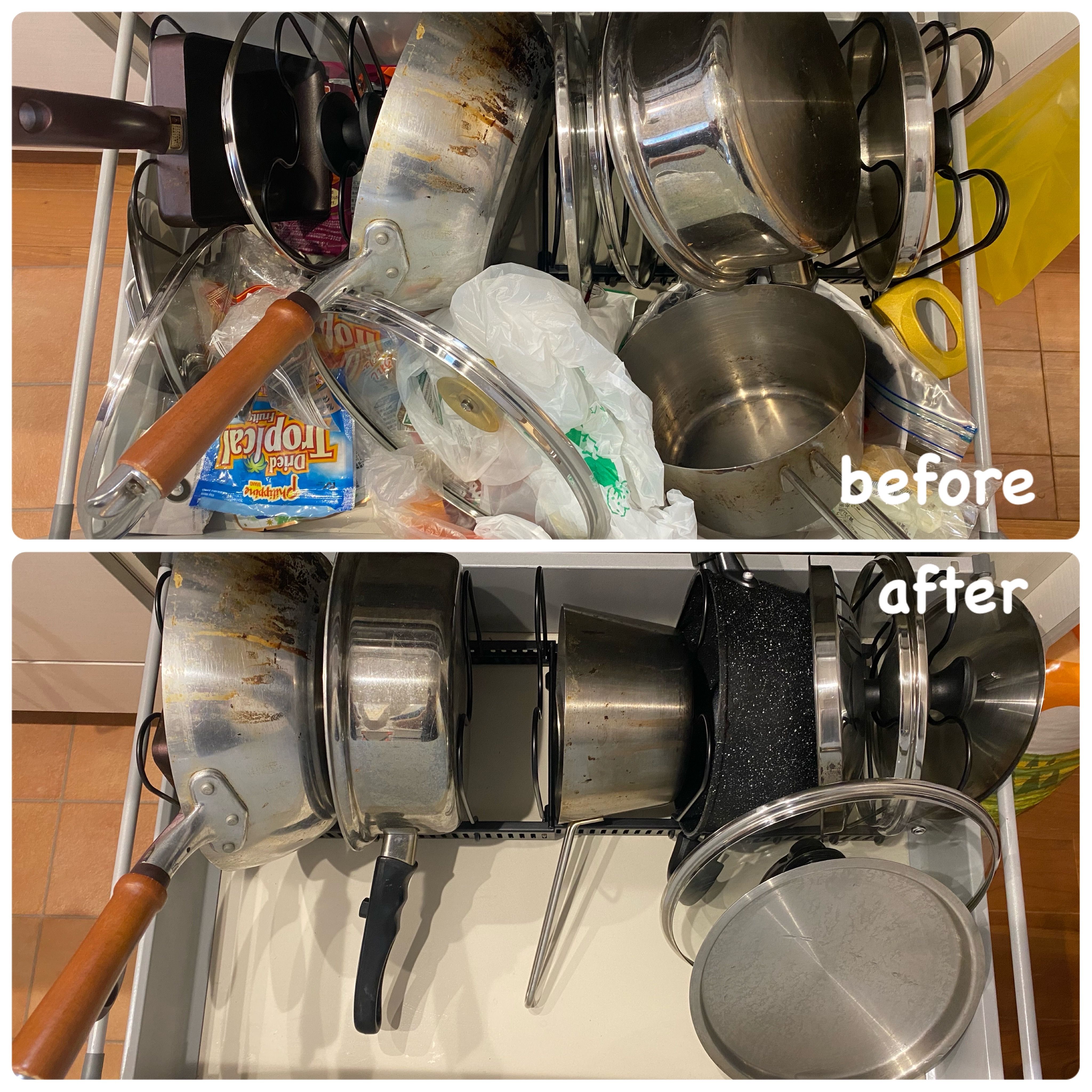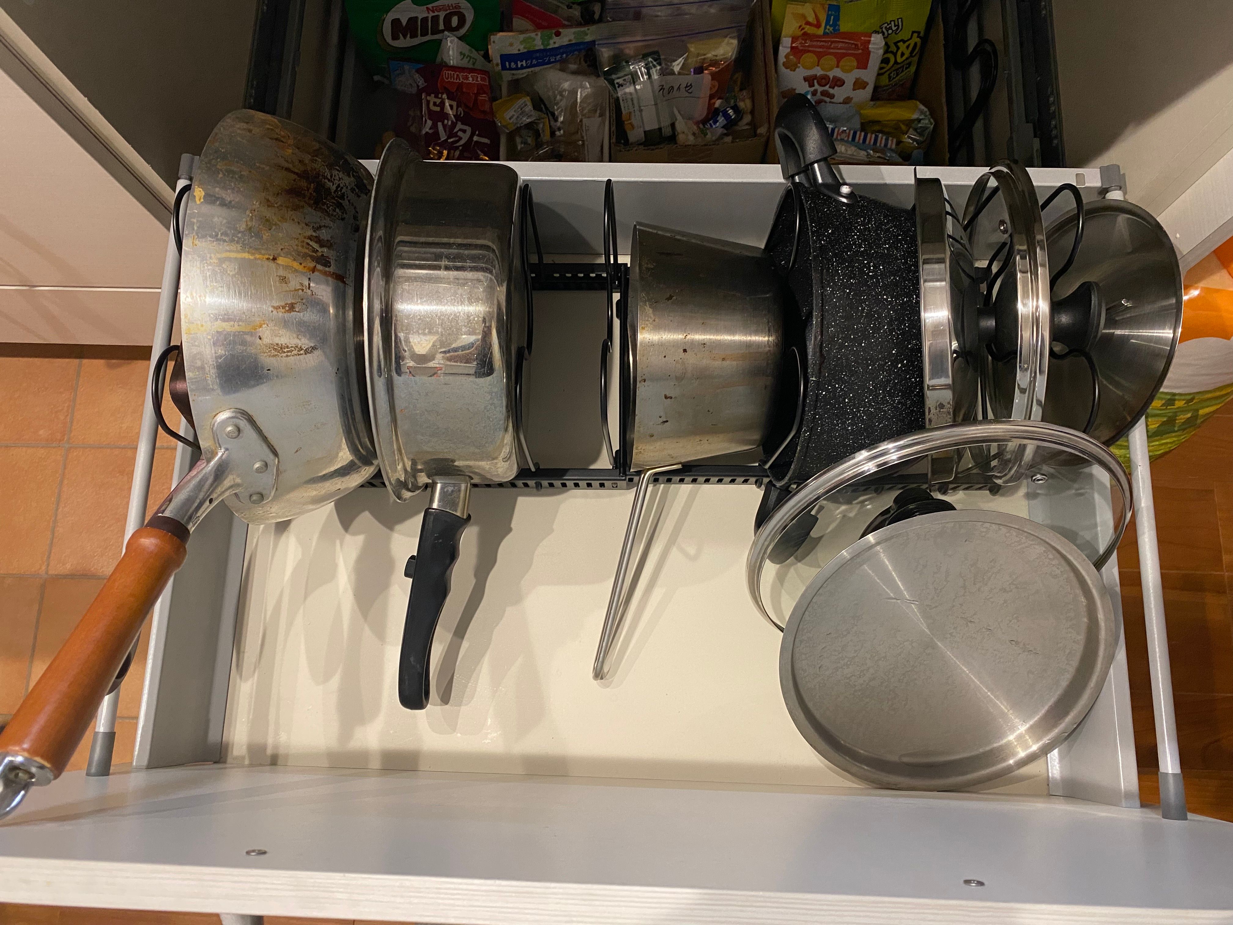 今回のお客様宅では、よく使うフライパンや鍋、調理器具類がすべて一緒に収納されていました。
