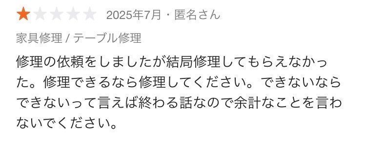 7/11 家具の修理依頼で現場に行くととても粗悪な家具で修理箇所3の予定が52カ所もあり修理ストップ。