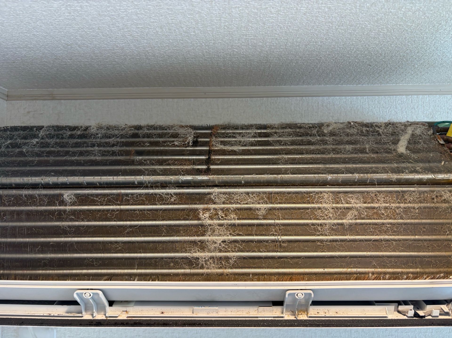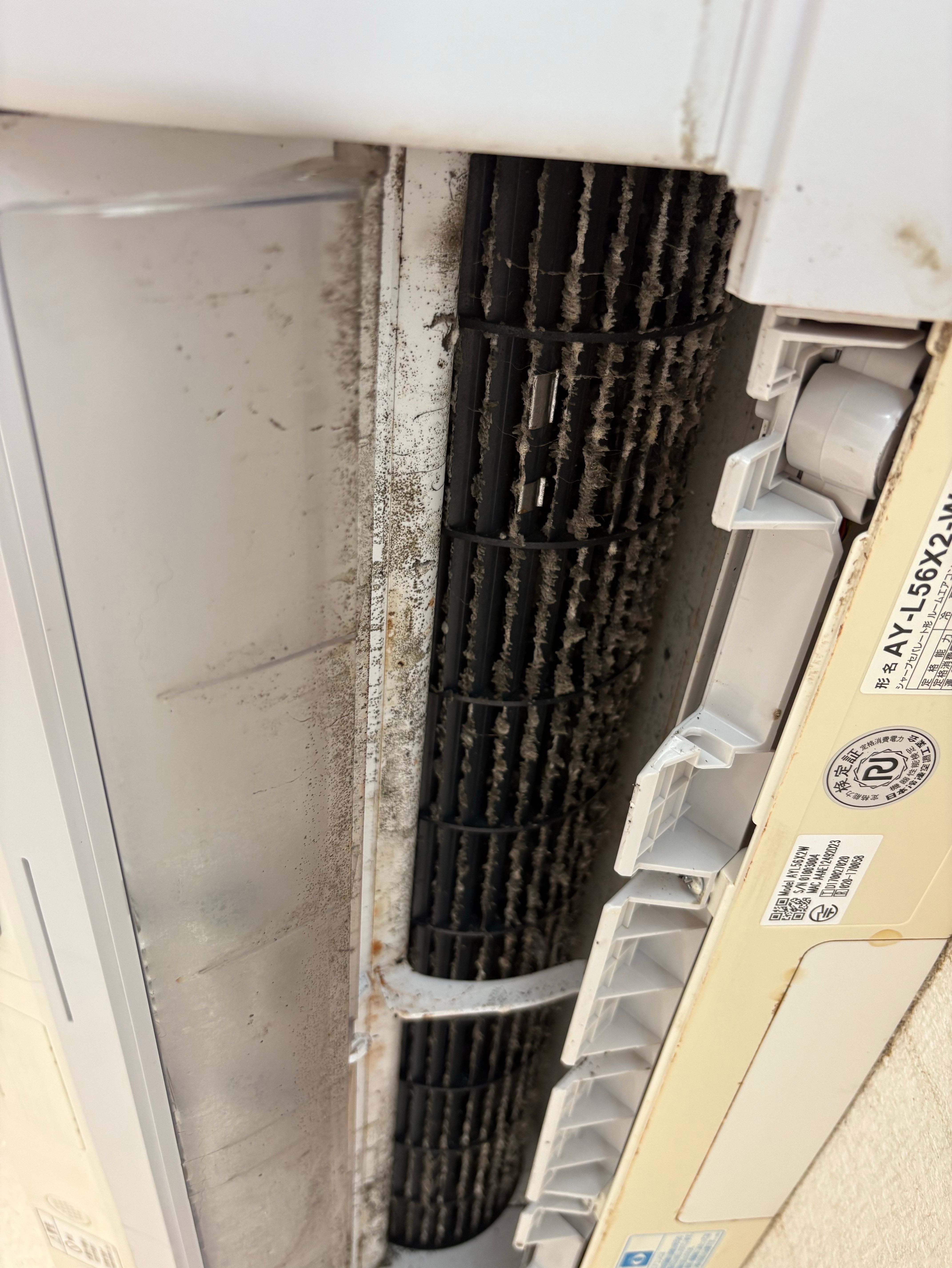 エアコンを分解してみると、フィルターや熱交換器に毛がビッシリと付いていました。