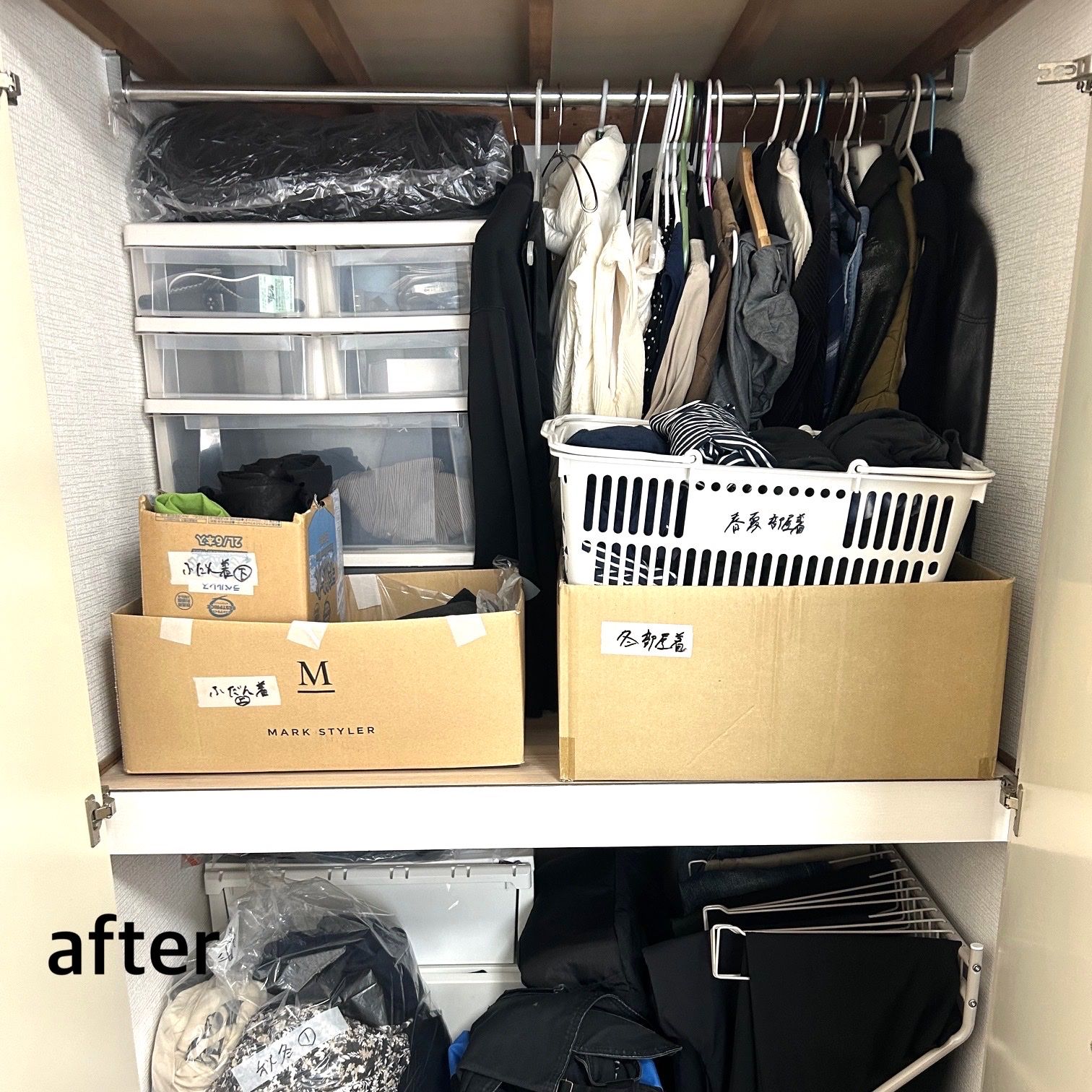 棚に置かれたままのお洋服が沢山ありましたが、ハンガーに掛けられるものは掛けて、畳むものは用途ごと(普段着・部屋着)や季節ごとに仕分けしたことで、ぱっと見てどこにどんな服があるか分かりやすくなりました🤩✨