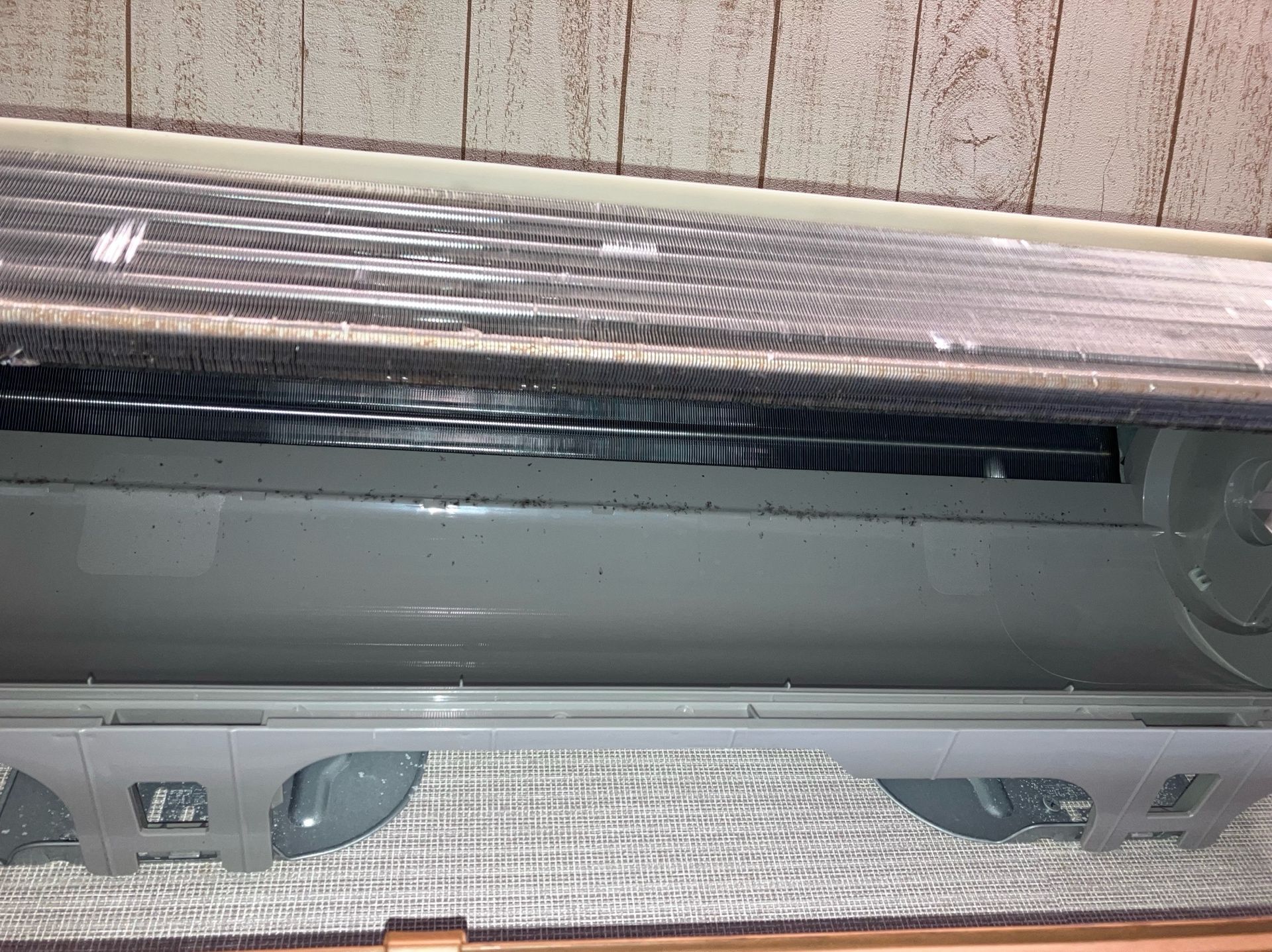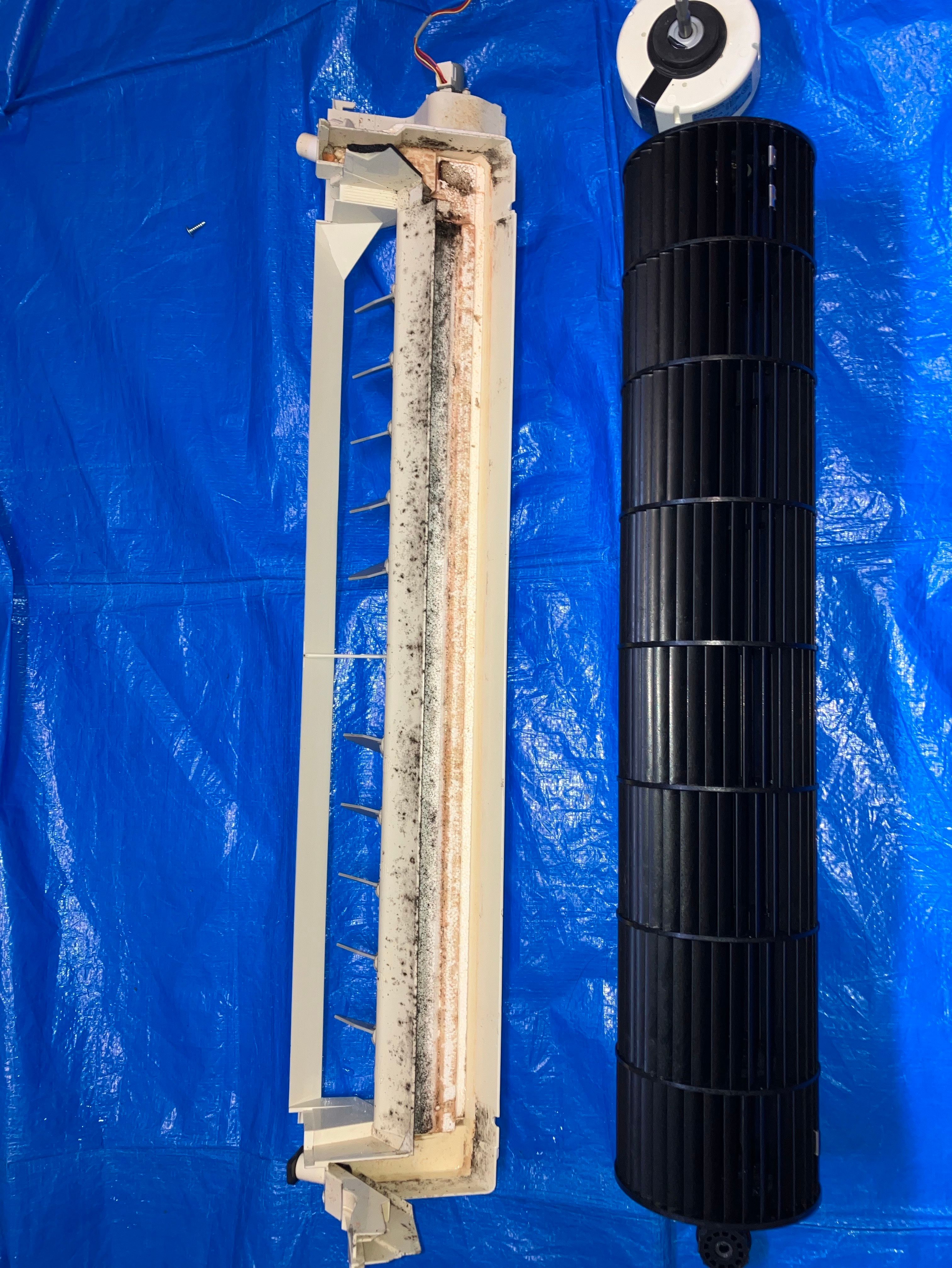 これでもある程度の汚れやカビは取れますが、送風ファンやドレンパン(結露を受ける部分)までは分解しないことが多いため、奥に残った汚れが再びカビやニオイの原因になってしまいます。