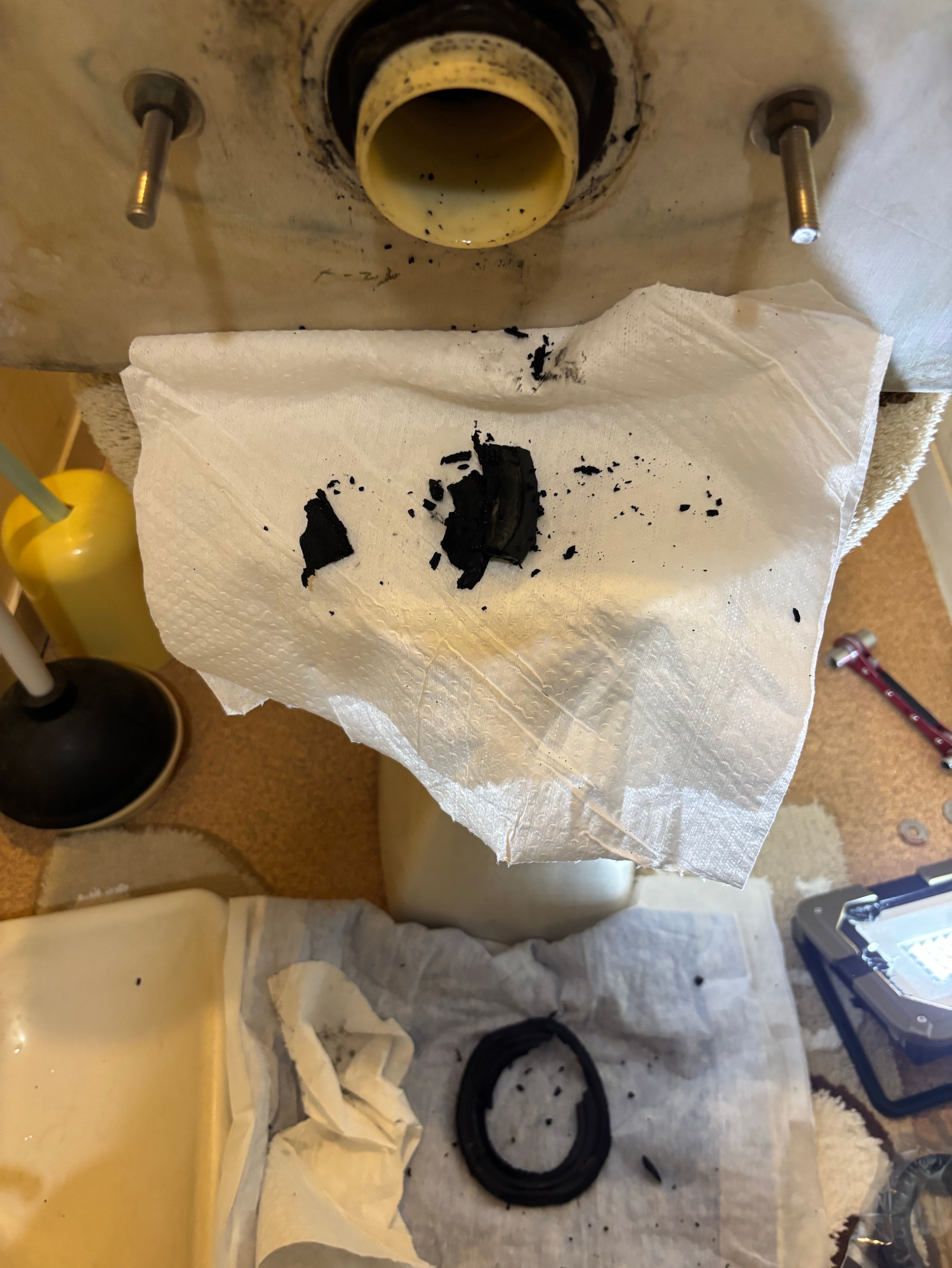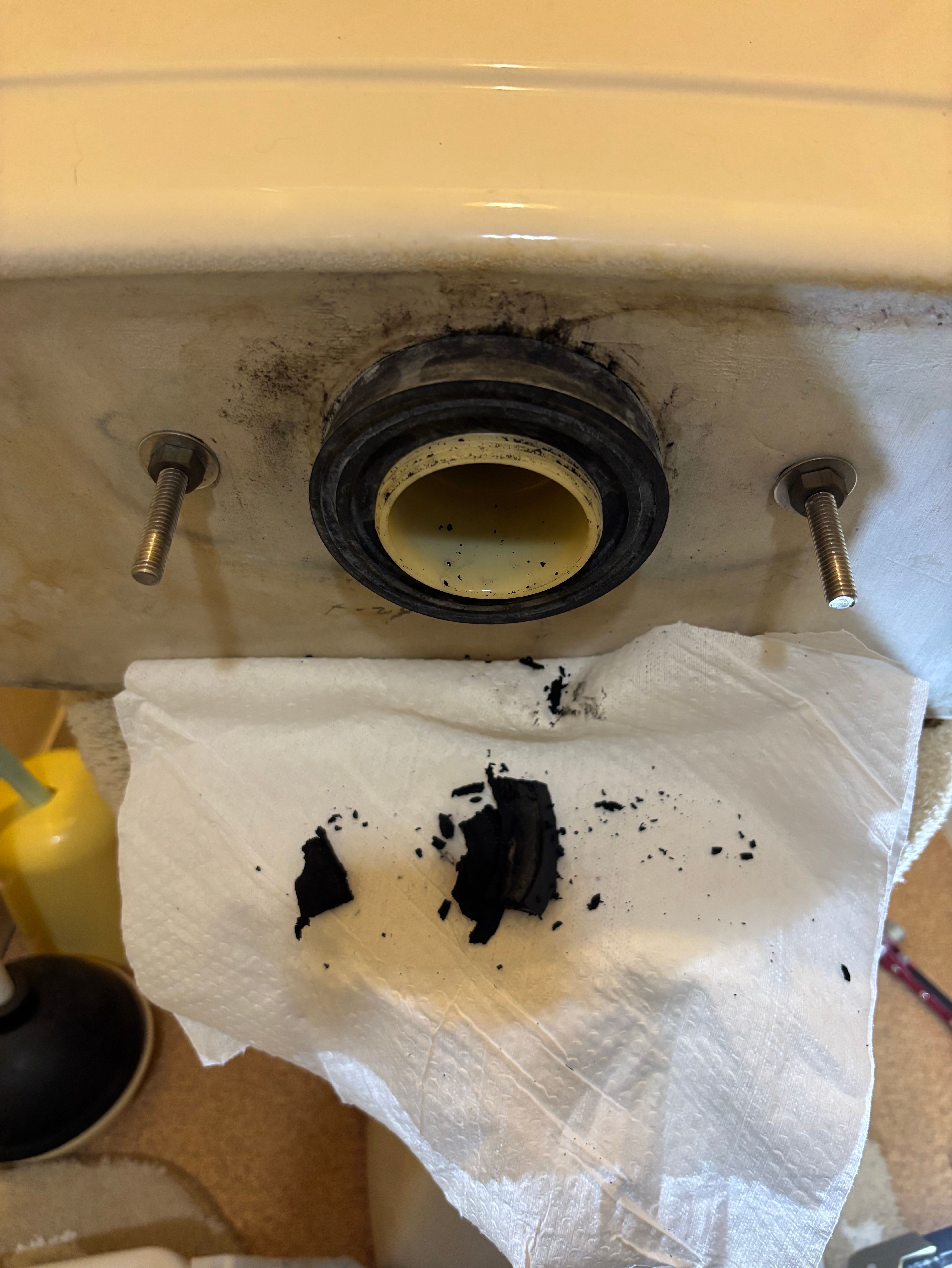トイレの便器裏からの水漏れ依頼です。タンクを脱着し、みっけつパッキンの交換をしました。