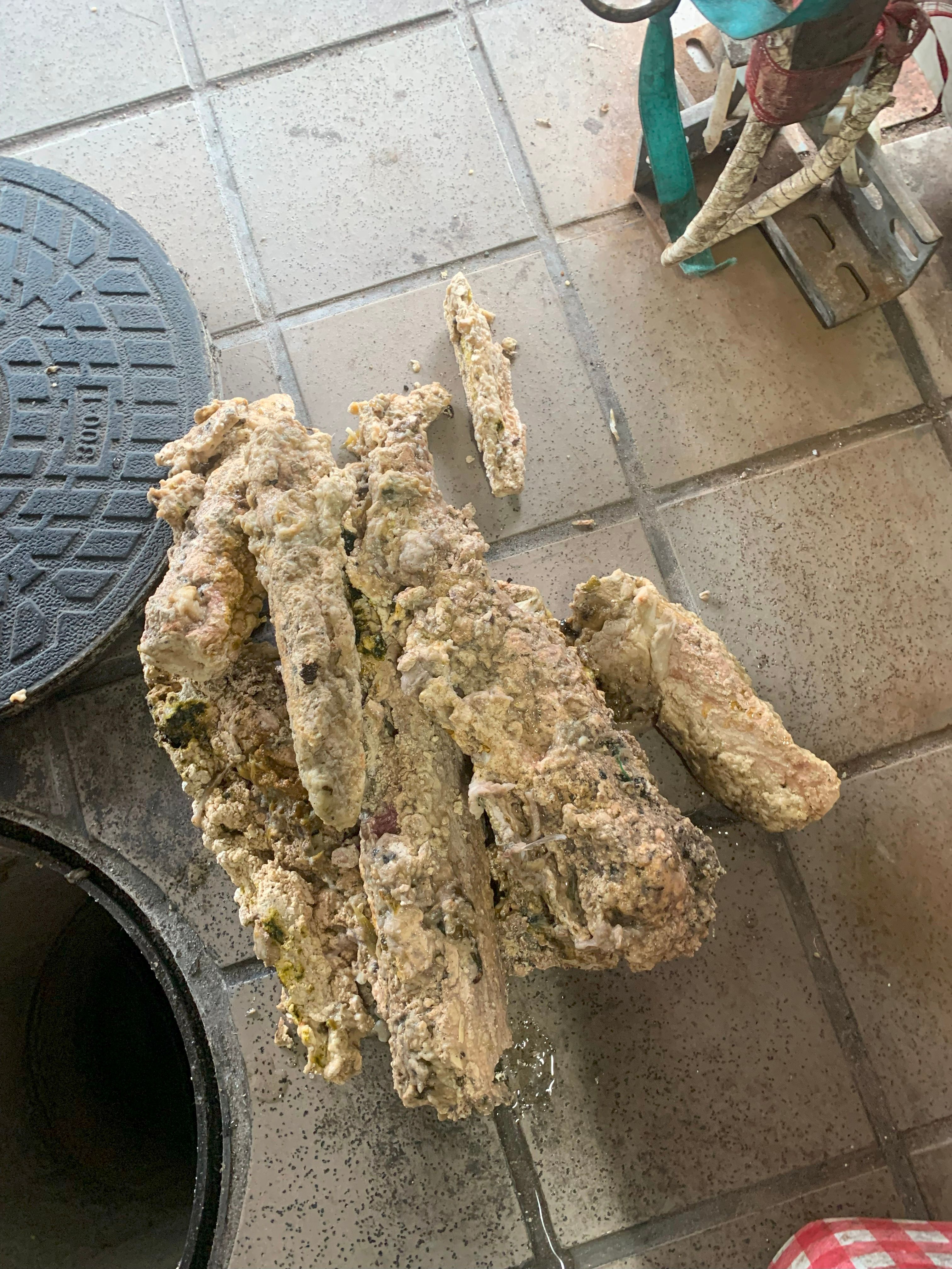現場調査の結果、屋外排水桝の中に大量の油脂が固形化したものが堆積しており、配管内部で完全に詰まっている状態でした。これは日常的に厨房から流れる油や洗剤成分が徐々に蓄積し、時間の経過とともに固化したものです。