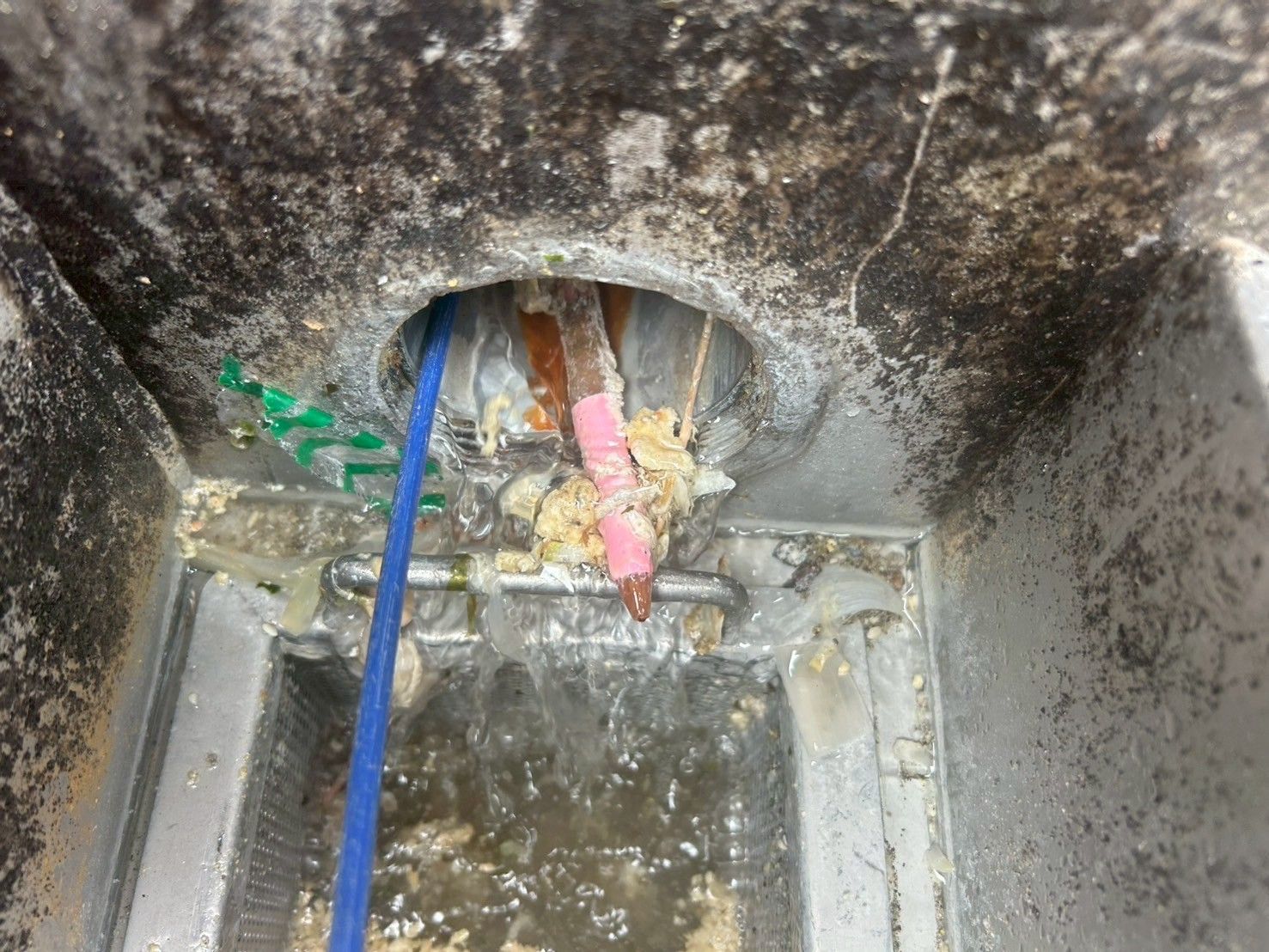 厨房内の排水が詰まり、高圧洗浄+カメラ調査で対応しました。