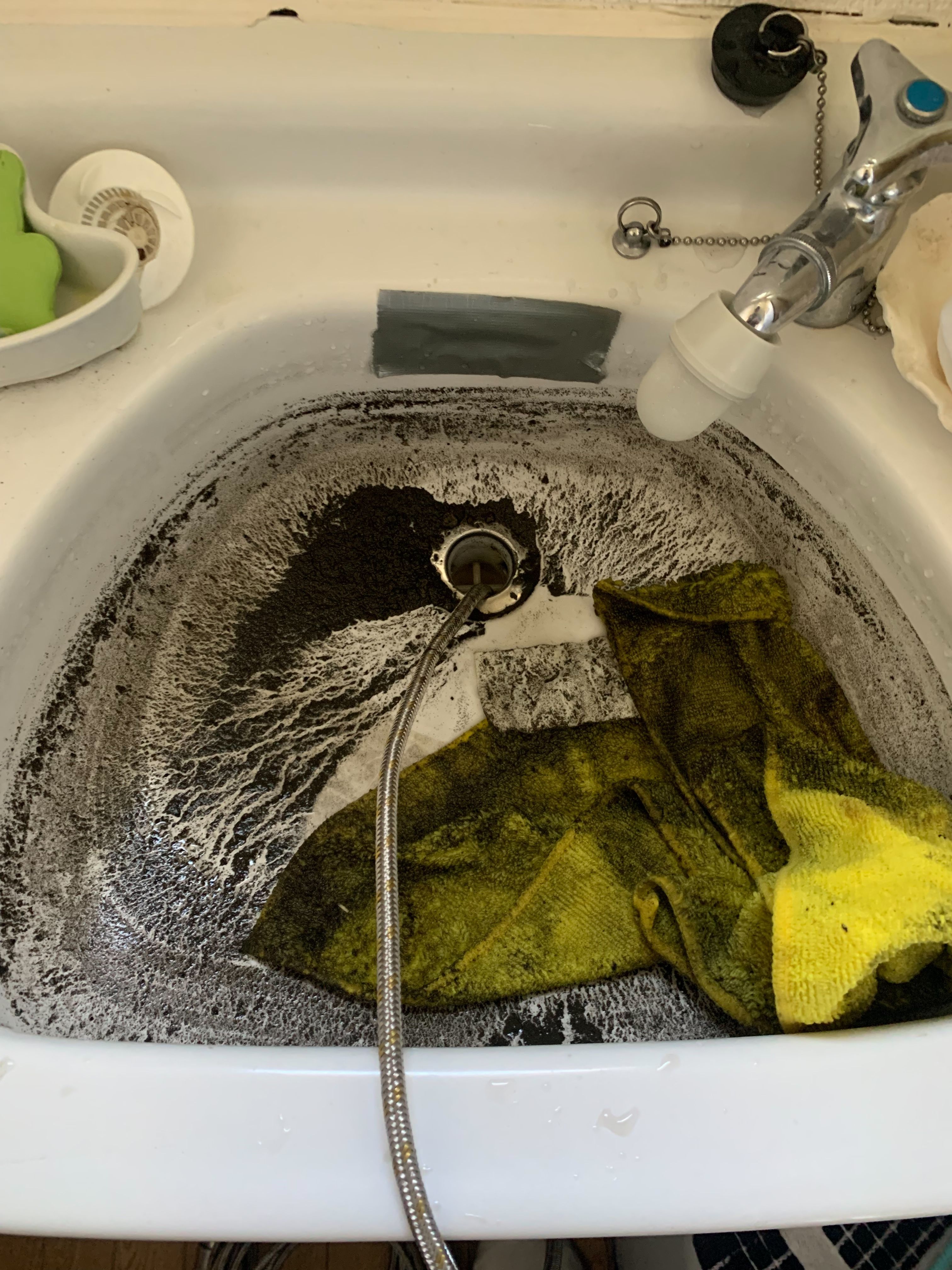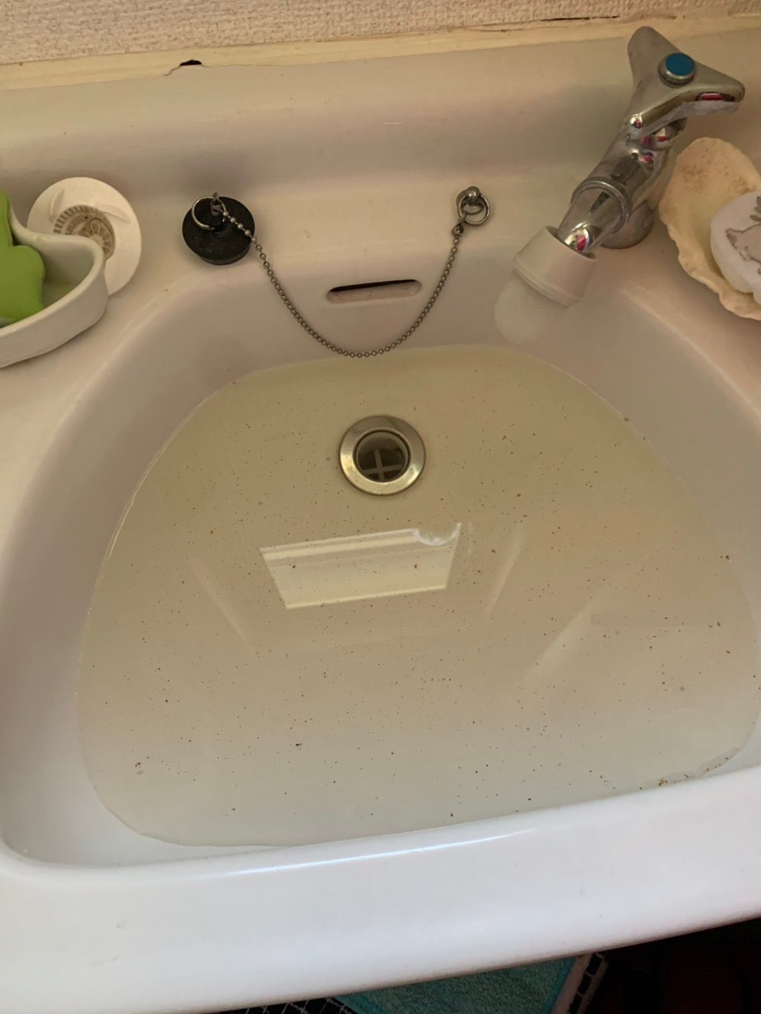 作業前は水がまったく流れず、ボウルにたまったままでしたが、施工後はスムーズに排水されるようになりました。洗面台周辺の清掃も行い、衛生的な状態に戻しました。