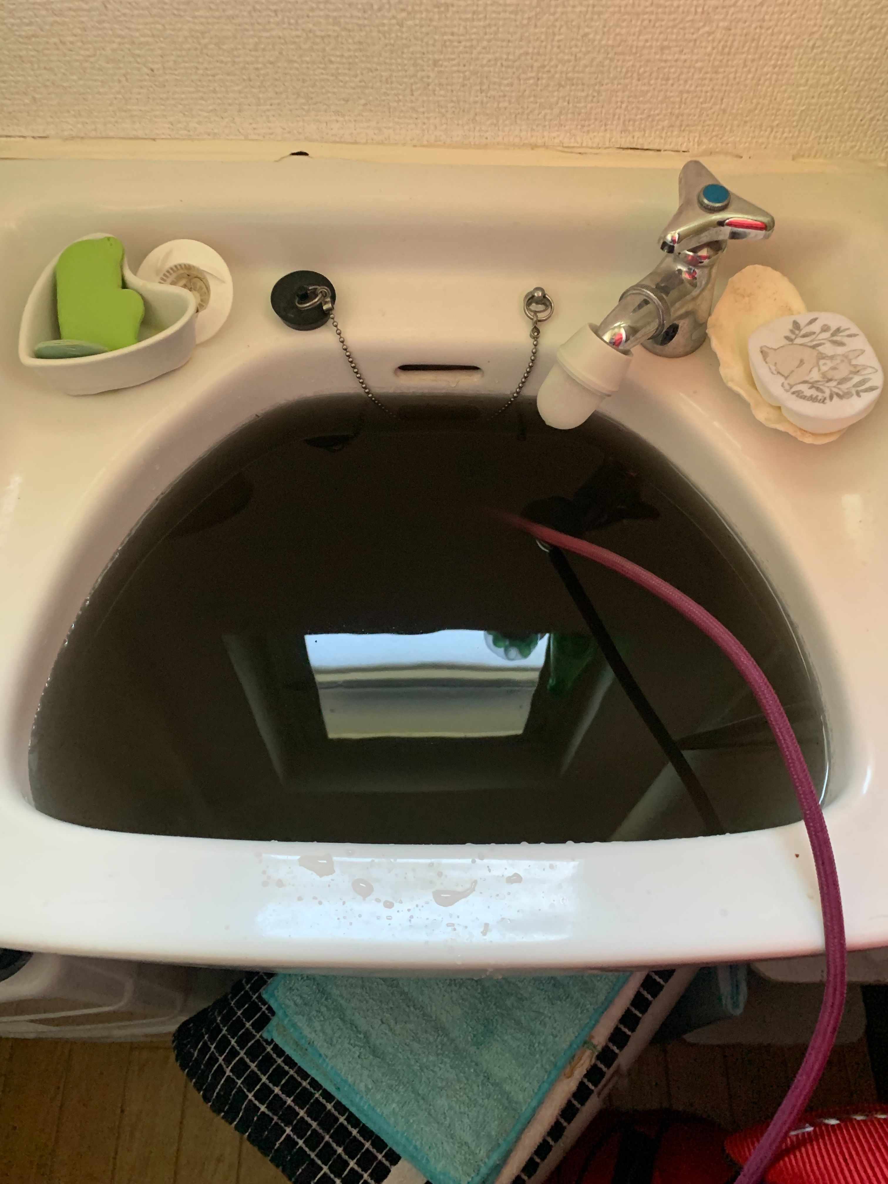 洗面台に水をためると、まったく排水されず時間の経過とともに逆流が発生。ローポンプで試したものの、びくともしない状況でした。