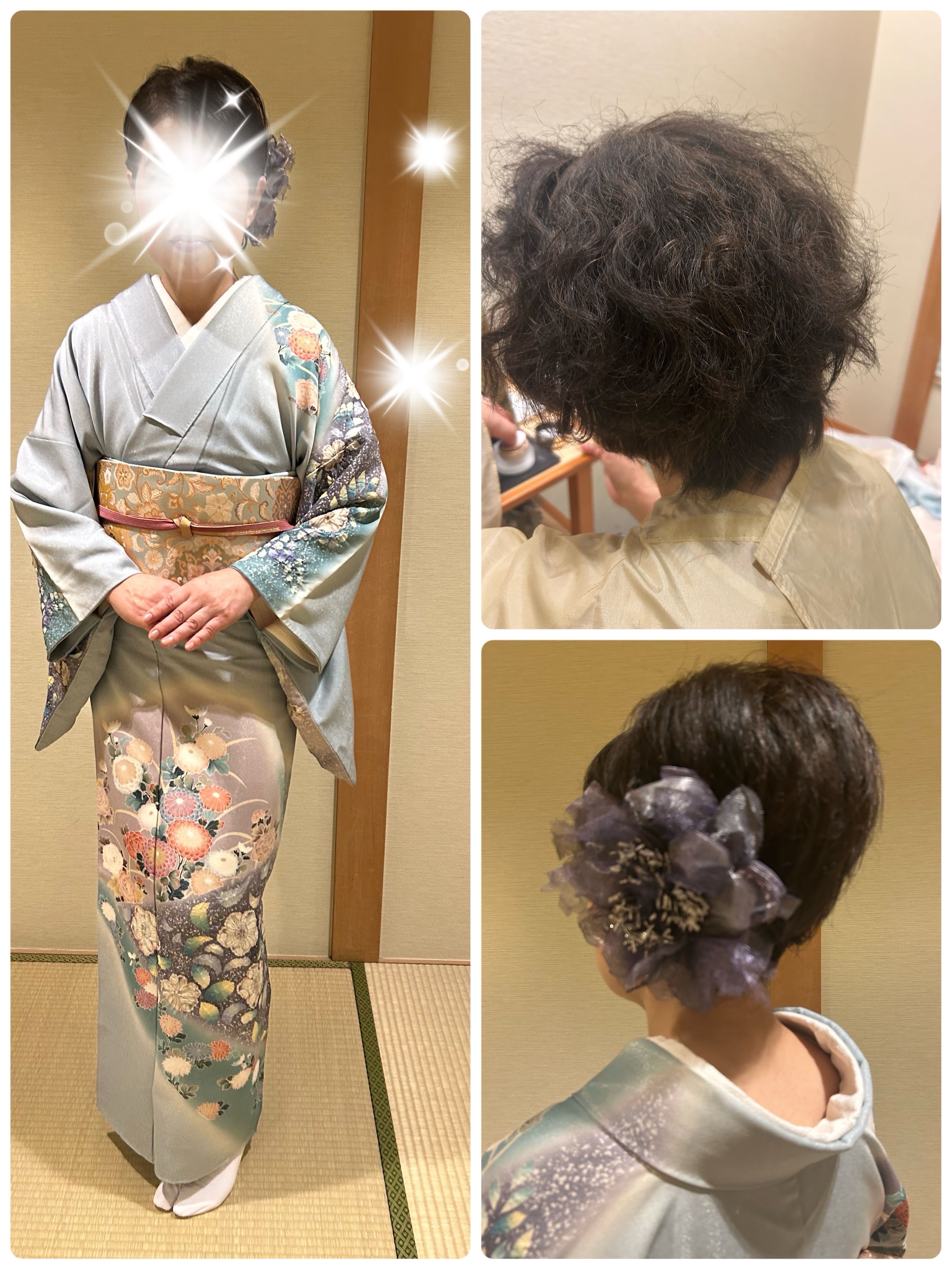 リピートでご依頼のお客様。パーティーへご出席です。辻ヶ花の素晴らしいお着物がとってもお似合いです。ショート、癖毛でも、アップ風に仕上げました。お気に召して頂きありがとうございますm(_ _)m