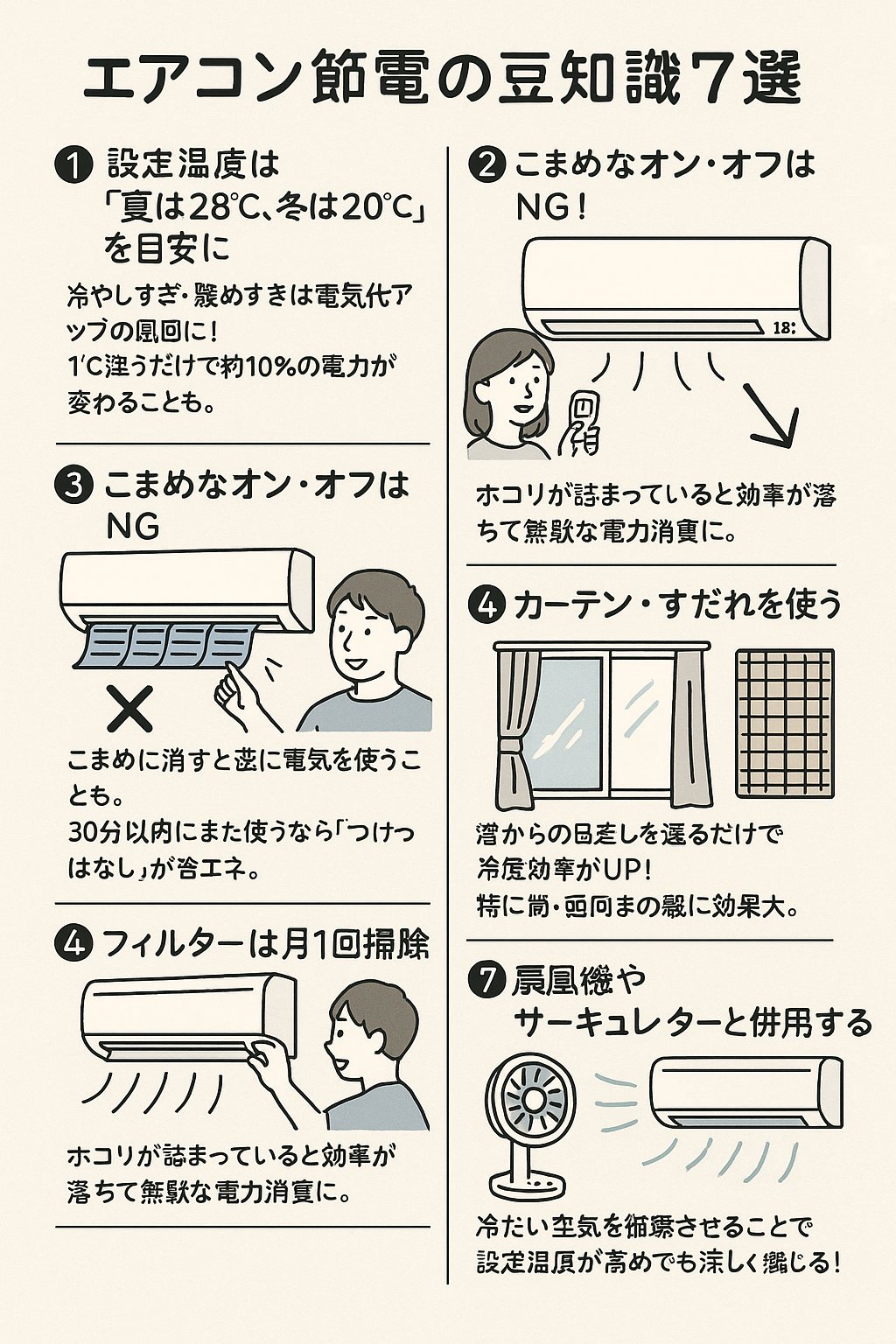 エアコン節電にまつわる豆知識をチャットgptにイラストにしてもらいました。賢いですね。