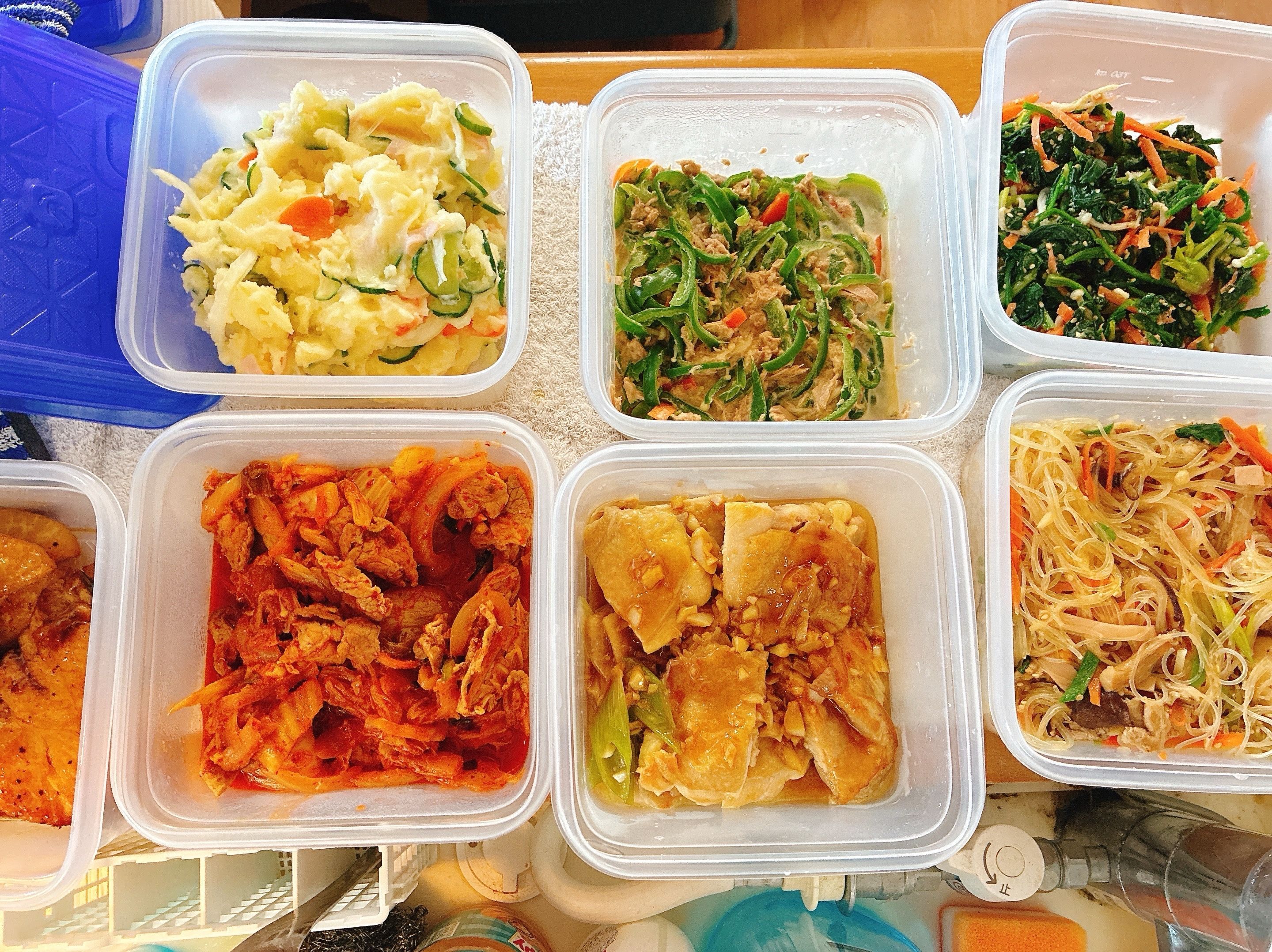 リピートのお客様です。お客様のリクエストでチャプチェを作りました。他はお任せで作らせていただきました。・チャプチェ・チキンガーリックステーキ・ブリと大根の照り焼き ・豚肉とキムチの炒め・ポテトサラダ・ピーマンめんつゆ煮・3色ナムル・具たくさん野菜スープ (写真には写っていないです)