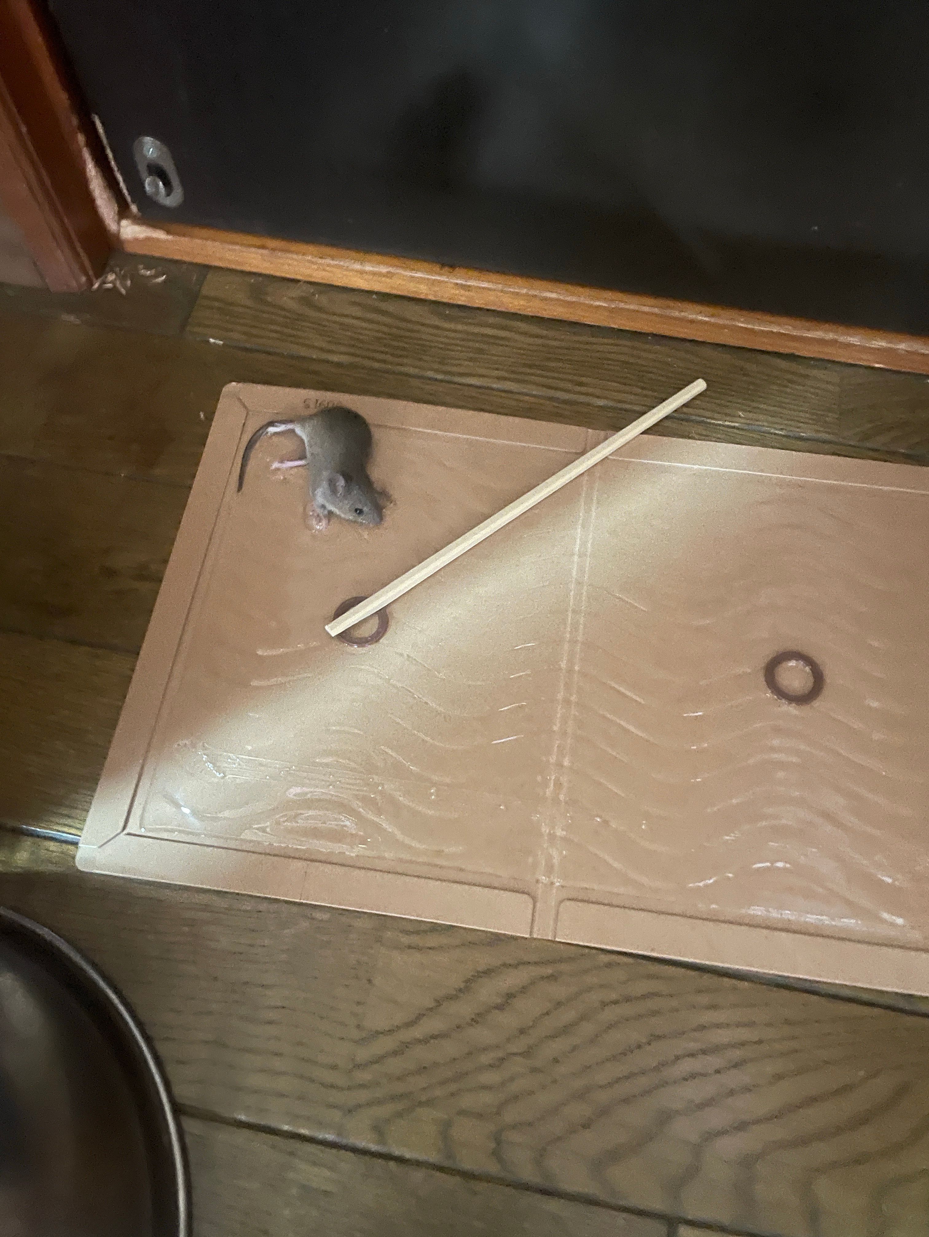 朝、お嬢様がご飯を食べている時に小さなネズミの赤ちゃんがリビングを歩いてきたので粘着シートで捕まえたとの事