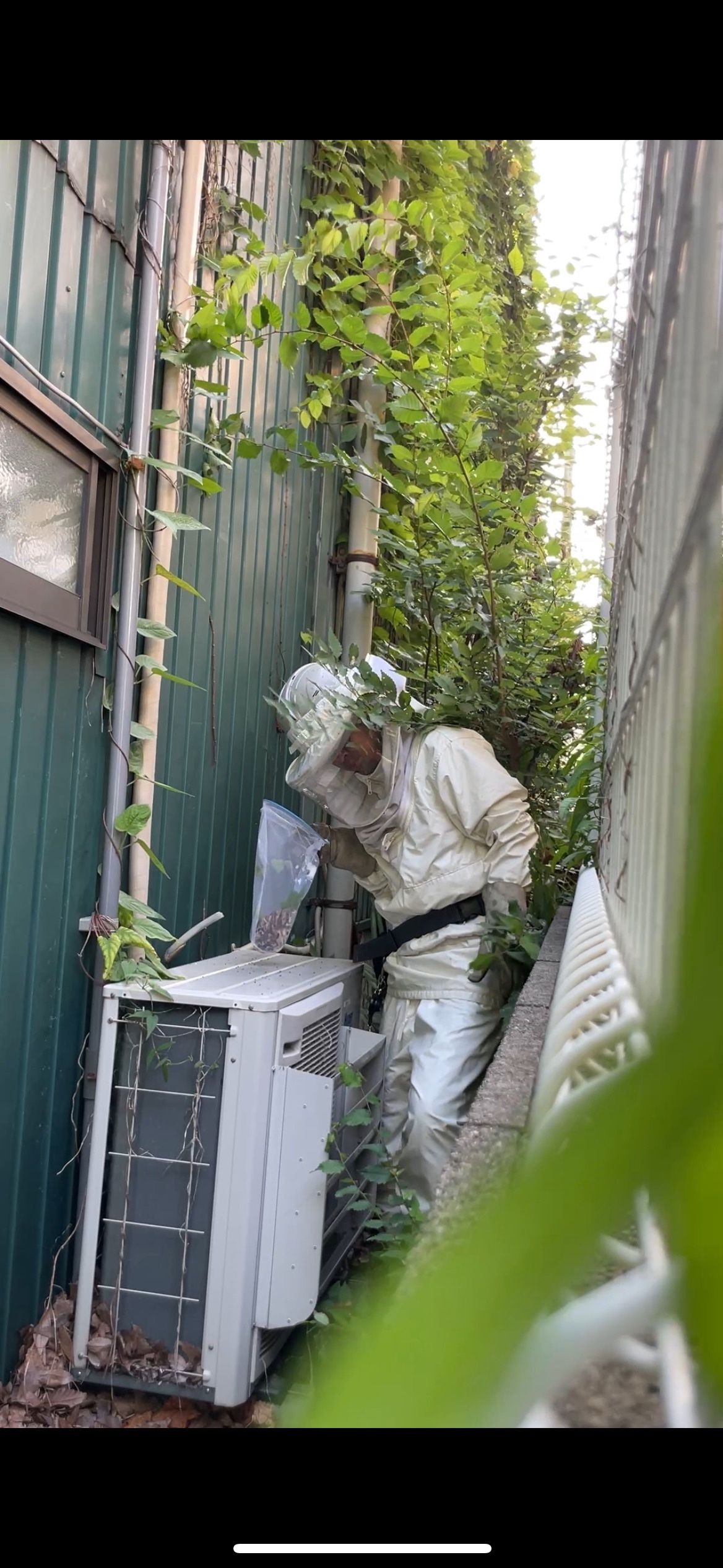 バイク屋の蔦が絡まった狭い場所でスズメバチを取る