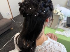 訪問美容メニューに婚礼のホテルへ出張します。 ブライダルヘアメイクの中座に、ロングスタイルからばっさりミディアムスタイル、ショー...