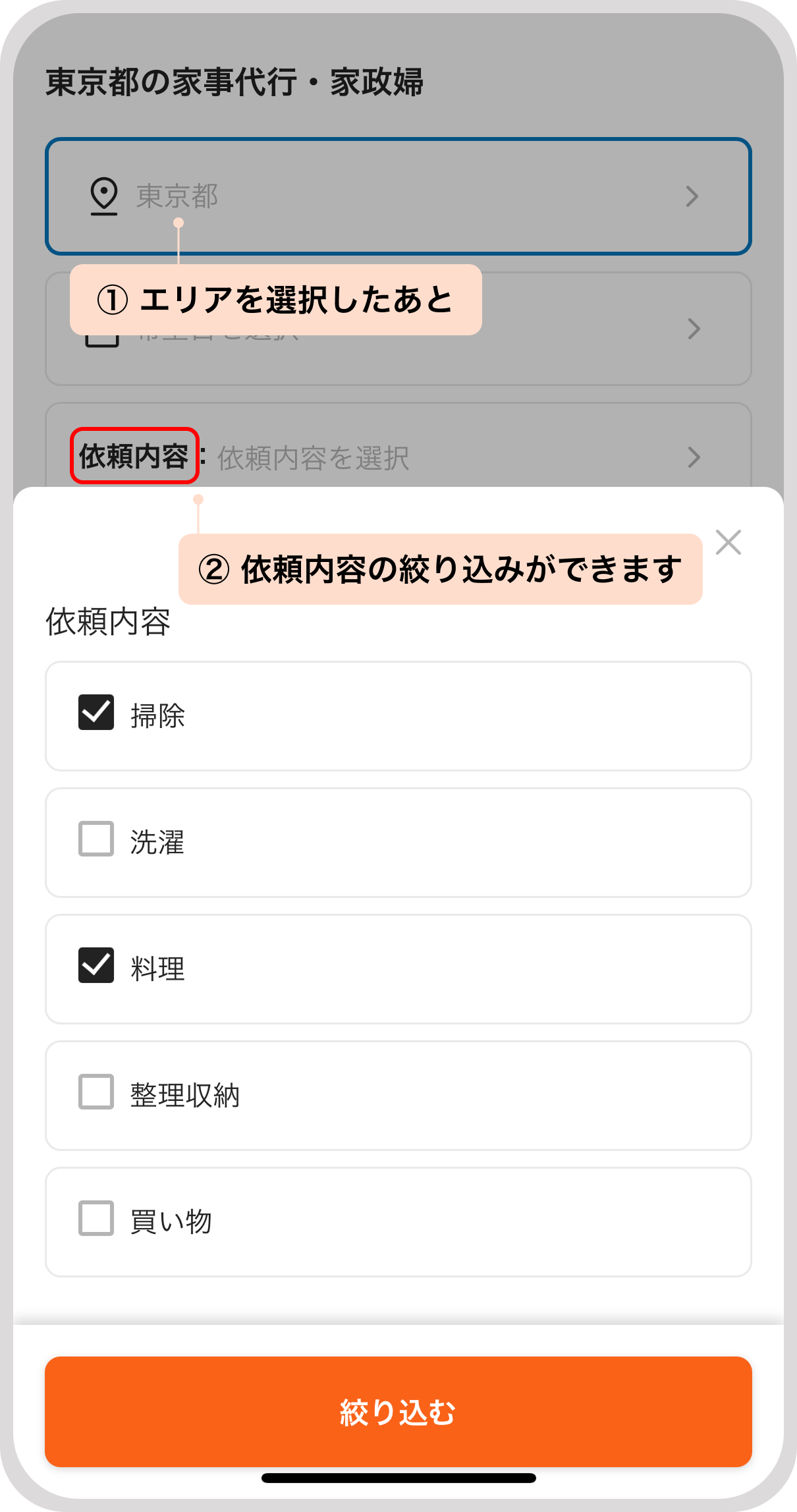 掃除・洗濯・料理・整理収納・買い物から依頼したい内容を絞り込んで、対応可能な店舗の検索が可能です✨