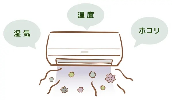 - 冷房や除湿を使うと、エアコンの内部で結露が発生しカビが生えやすい環境をつくります。