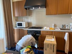 施工前の写真です。45cmのキャビネットと右のコンロ下のキャビネットを15cmカットして施工 扉及び引出を外した所です。 ...