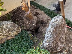 この度もまたお世話になりました。樹形の残念なモチノキの抜根をお願いしました。前回の白梅の伐採抜根は宅内にいた僅かな間に終えられていましたので、今回は庭で見学がかなうよう努めました。 youtubeに揚げられた素人で出来る抜根紹介の画像を見ると何とかなるかもしれないと思ったりしましたが、実際を見学しますとつぎようなことからとても素人では無理だということを実感させられました。①専用の道具(根を吊り上げることの出来る大きなクレーン搭載車。根に絡まる土を取り除いたり根を土中から堀り起こす際にも用いる金属製の丈夫な長いヘラ様の専用の道具。土中に長く伸びている根を切るノコギリなど。これらはとても力ならびにコツを必要とする様で、素人では出来ないことだと思いました。)②経験により培われた習熟された技術(土の中に自由に生えている該当の根を探り堀り、的確に切断すること。クレーンで吊り上げるロープの角度や方向を操作しつつ、左右はじめ縦横に長く伸びた根を綺麗に土中から表に出現させて綺麗に処置すること。) 狭いわが家の場合は、塀の外から丈夫な金属製ロープ(チェーン?)を根に掛けて吊り上げつつクレーン車におさめる方法となりました。抜根は通常ですと土の上の幹部分にロープを掛けて吊り上げるとのことですが、当初時間を掛けて自力で何とかしようと思い、土を掘って幹部分を切断していました(根が様々な方向に成長していましたので、間も無く諦めました)。その為、リョクケイさんはさらに掘り根を持ち上げられるように金属製ロープを掛けられました。余分な手間をお掛けいたしました。誠に申し訳️なく思いました。 さて、見学して最も印象に残ったことは、クレーンを操作して根が吊り上げられる段階です。はじめはバキバキと言う音とともに①右側一面の土表面が映画のように持ち上げられ、次第に土中の根が出現しました。その処置が終わると、つぎに②左側一面の土表面が持ち上げられると、何と長い長い自然薯の様な根が出現しました。これで土中の根は先端まで綺麗にとれましたよ、と言うリョクケイさんの笑顔に感謝のみです。 最後はそこには何も植えられていなかったかの様に綺麗な状態にしていただきました。このたびもお疲れ様でした。おかげさまでスッキリ感が半端ないことこの上もありません。誠に有難うございました!今後ともよろしくお願いいたします。