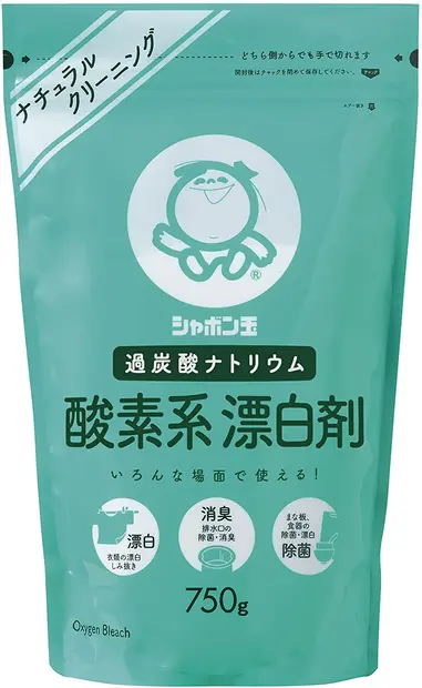 台所・掃除・洗濯など使用範囲が広く、使い勝手がいい「酸素系漂白剤」。成分の過酸化ナトリウムがとけて酸素が発生することで漂白・消臭・除菌ができます。塩素系漂白剤とは異なりツンとしたニオイはなく、洗濯時は色柄物にも使えます。塩素ガスが出ないため安全安心なのも魅力ですね。